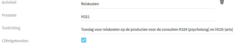 Vink onderaan het formulier de opties ‘Zichtbaar maken voor gebruiker’ en ‘Geen pop-up tonen na verslaglegging’ aan. De eerste optie maakt registreren buiten de normale tijdregistratie mogelijk. De tweede voorkomt dat de behandelaar dubbel om tijdregistratie wordt gevraagd. De omschrijving van de activiteit kan vrij gekozen worden, maar het is logisch deze dicht bij de omschrijving van de prestatie te houden. Het is belangrijk om hier ook aan te geven dat het clientgebonden is, anders is een declaratie niet mogelijk.