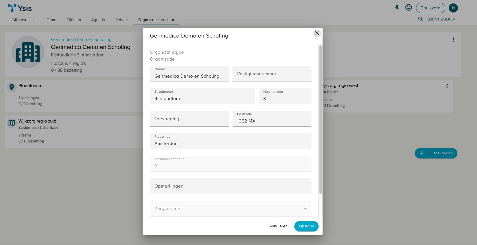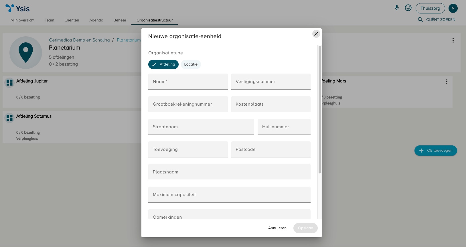 Klik op ‘+OE toevoegen’, vul de gegevens in, selecteer de juiste zorgvorm en klik op ’toevoegen’. Het team of de afdeling is toegevoegd. Selecteer ‘Nog een eenheid aanmaken’ om meerdere OE’s toe te voegen.