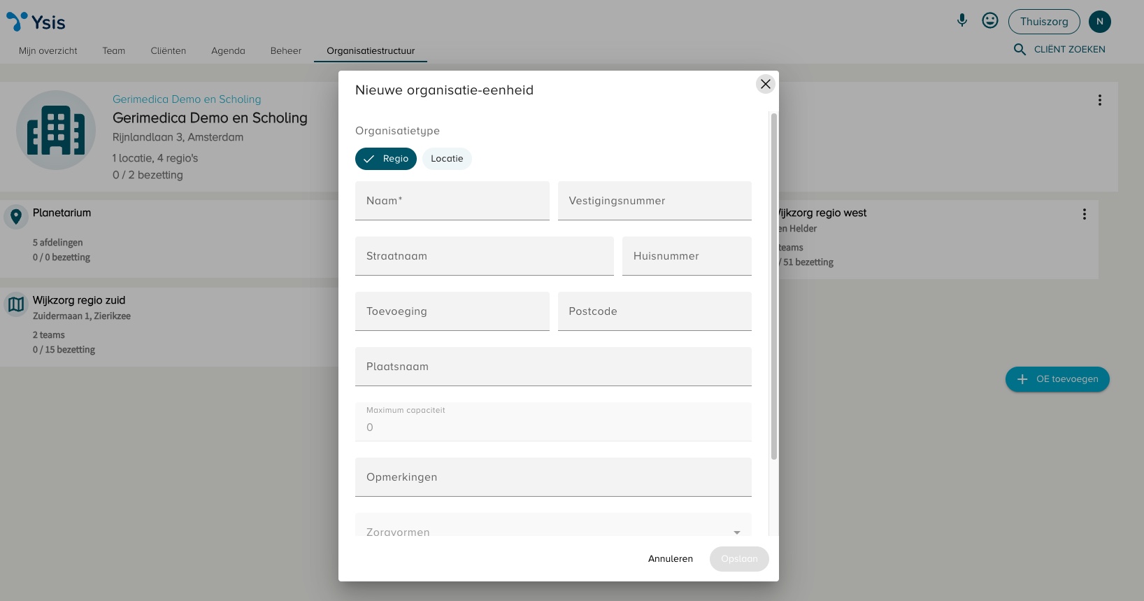 Kies voor ‘regio’ of ‘locatie’. Vul de naam, eventuele adresgegevens in en klik op ‘opslaan’. De regio/locatie is toegevoegd. Selecteer ‘Nog een eenheid aanmaken’ om meerdere OE’s toe te voegen.