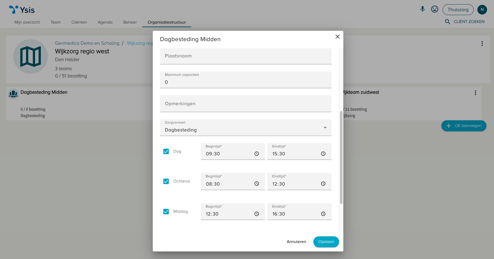 Indien de zorgvorm ‘Groepen’ is geselecteerd, is het ook mogelijk om dagdelen en begin- en eindtijden in te richten. Dit zodat er bij het aanmaken van een zorgarrangement, de juiste (openings)tijden van de afdeling wordt getoond en deze in de agenda van de client kan worden gepland.
