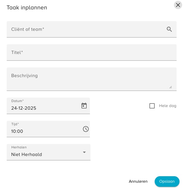 Zodra ‘Taak inplannen’ is geselecteerd, verschijnt er een pop-up waarin je de volgende velden kunt invullen. Velden met een sterretje (*) zijn verplicht: