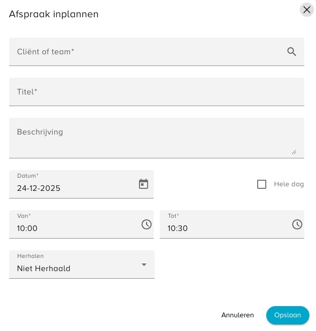 - Cliënt of Team: Selecteer de cliënt of het team. Als de agenda vanuit het dossier van een cliënt is geopend, is de juiste cliënt al automatisch ingevuld. Als de agenda vanuit de Team pagina is geopend, is het juiste team al automatisch ingevuld.
